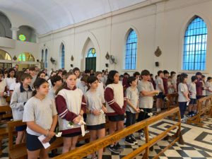 Los alumnos de 7° Grado A y B se reunieron para participar de este acto de fe que simboliza la culminación de sus años en el Nivel Primario y el paso hacia la Secundaria. La consagración es un acto profundo de compromiso personal y espiritual, donde los estudiantes ponen bajo el amparo de la Virgen su futuro y los desafíos de la nueva etapa que comienzan.