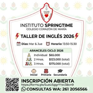Nos ponemos en contacto con ustedes para invitarlos a formar parte de nuestra propuesta del Taller de Inglés del Instituto Springtime 2026, diseñado para acompañar el crecimiento y desarrollo lingüístico de nuestros alumnos en cada etapa escolar.Sabemos que el idioma es una herramienta fundamental para el futuro, por lo que